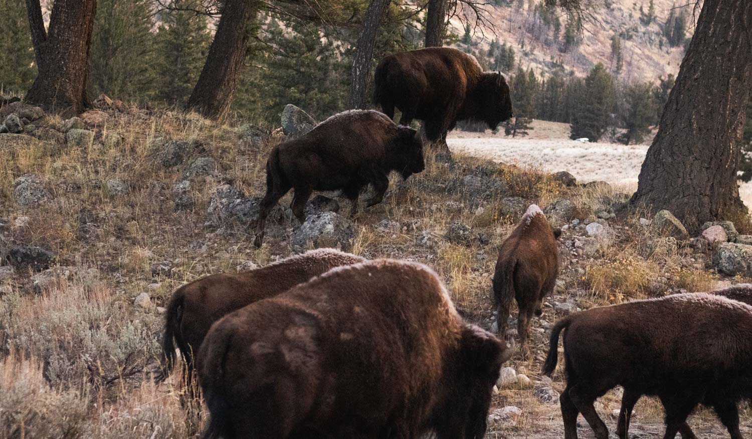 There were many moments where herds of bison crossed the road and caused traffic to be at a standstill, I was the lucky one at the front of the queue a couple of times which was a treat for taking photos and enjoying the massive beasts crossing the road. Many times, when photographers were pulled over and taking photos I stopped and managed to see a few lone wolves, a grizzly with 2 cubs and bison by the herds. As the sun set the colours turned into magnificent hues of peach and at that moment I was so happy I had left late that morning, I would recommend being in the park at either sunset or sunrise for the most spectacular views and colours.